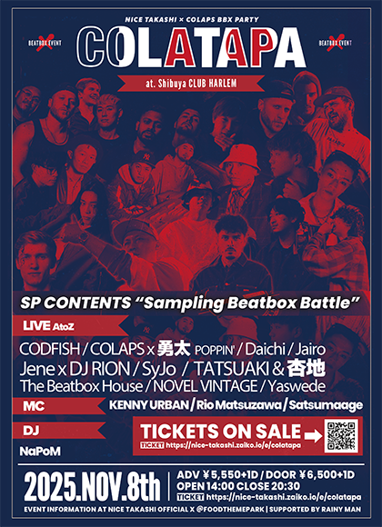 TATSUAKI × 杏地, JENE × DJ RION, COLAPS × 勇太 (Poppin'), Jairo, NaPoM DJ + perform, Kenny Urban MC + Perform, NOVEL VINTAGE, SyJo, Daichi, Codfish, Yaswede, THE BEATBOX HOUSE