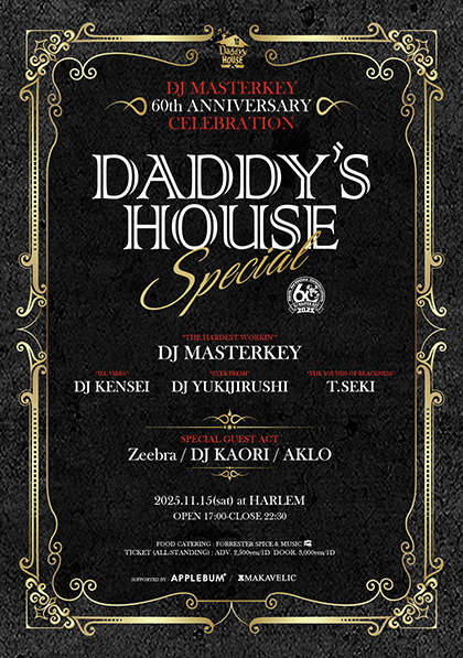 今回はDJ MASTERKEYの目出度い還暦スペシャル!日本にHIPHOPを広めてきたレジェンドのお祝いを自身がレジデントでもあるパーティーDADDY'S HOUSEにて開催します!!