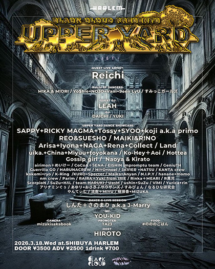 UPPER YARD DANCE SHOWCASE: SAPPY + RICKY MAGMA + Tossy + SYOO + koji a.k.a primo, REO & SUESHO, MAIKI & R!NO, Arisa + Iyona + NAGA + Rena + Collect, Land, uika. + China + Miyuu + toyokana, Ko-Hey + Aoi, Hottea, Gossip girl, Naoya & Kirato, airimon + めいサー, CoCoA + SENA, EISHIN impromptu team, GeniuTH, Guerrilla GO, HARUNA CREW, HIYO + noel, JAVIER + NATSU, KANTA crew, kokomi + ryo, K-Ring, KURO + Specter, Maika + Anyan, N.I.P.Y, hanane + momo, nm crew, Parim, RAIRA + Yuki from IRIE, Rinka + MEARI, R異児, Scorpion, SuZu + HAL, team HARUKI, UaSM, yshin × SuZu, VIMI, Yurica + rin, アリナミンぐら, ありゅ + おさき, サザナミーズ, すみびょん, なるひな研究会, やんてぃむ, 流南 + MIYU, 萌菜香 + MIZUKA